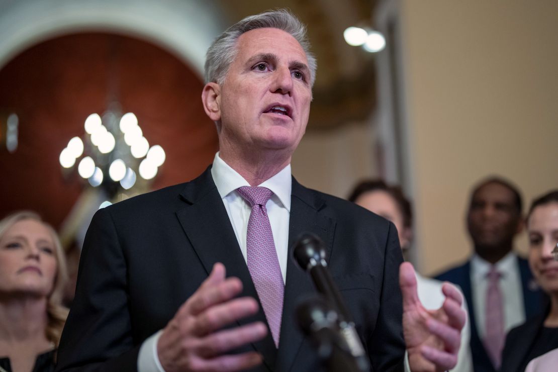 House Speaker Kevin McCarthy talks to reporters at the Capitol in Washington on March 24, 2023.